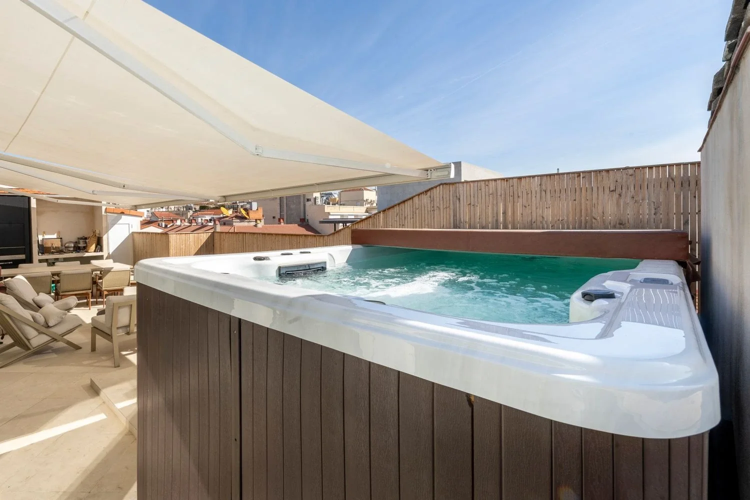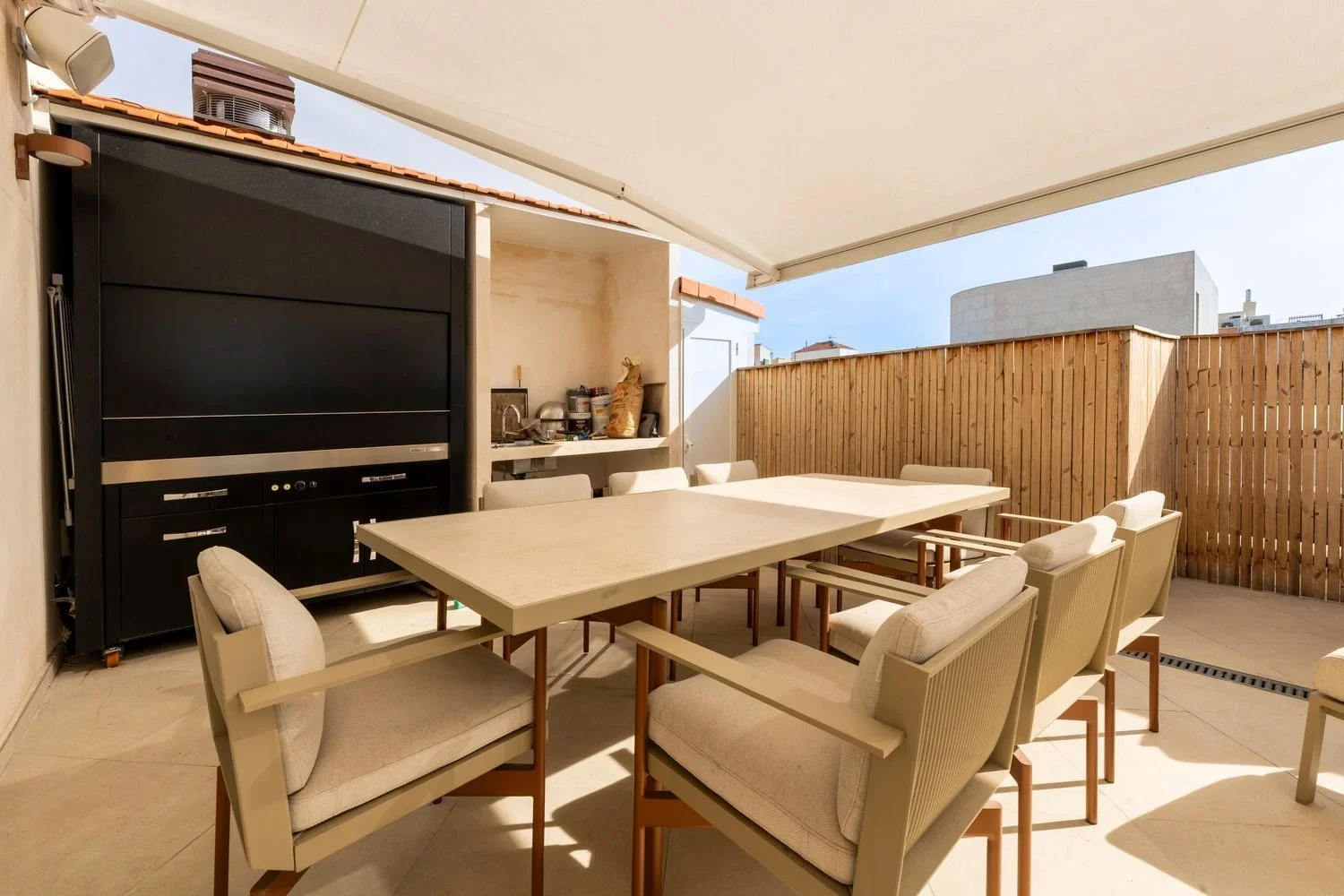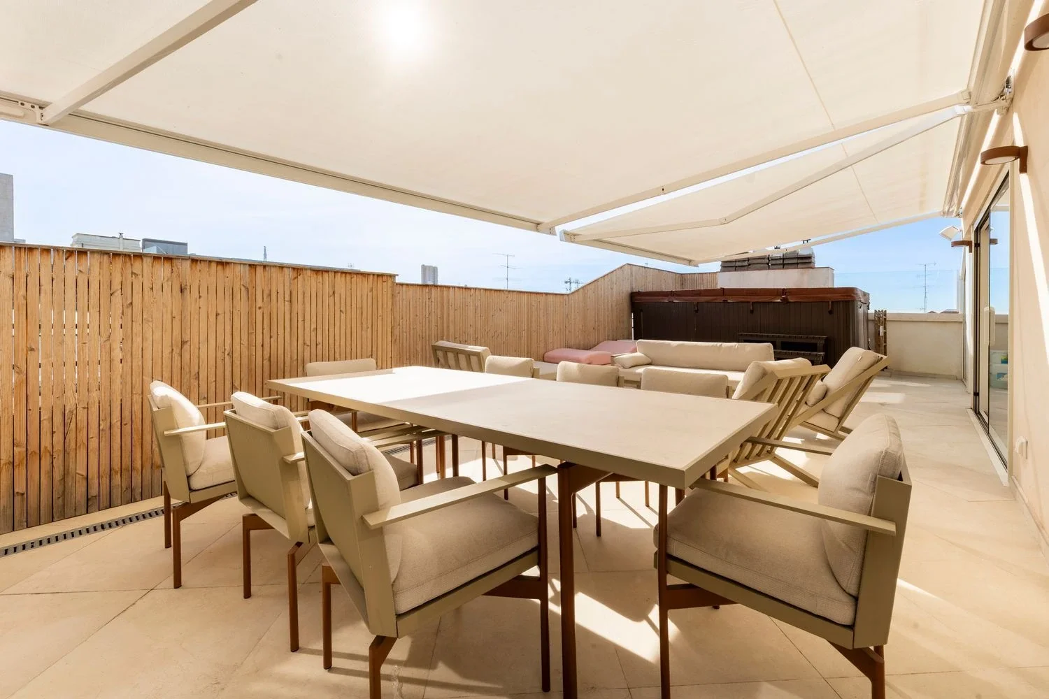El corazón de la vivienda es su impresionante terraza de 60 m², equipada con jacuzzi y zona de barbacoa de obra, perfecta para organizar reuniones al aire libre, relajarse o simplemente contemplar las vistas panorámicas de Madrid, gracias a su orientación norte, sur, este y oeste.