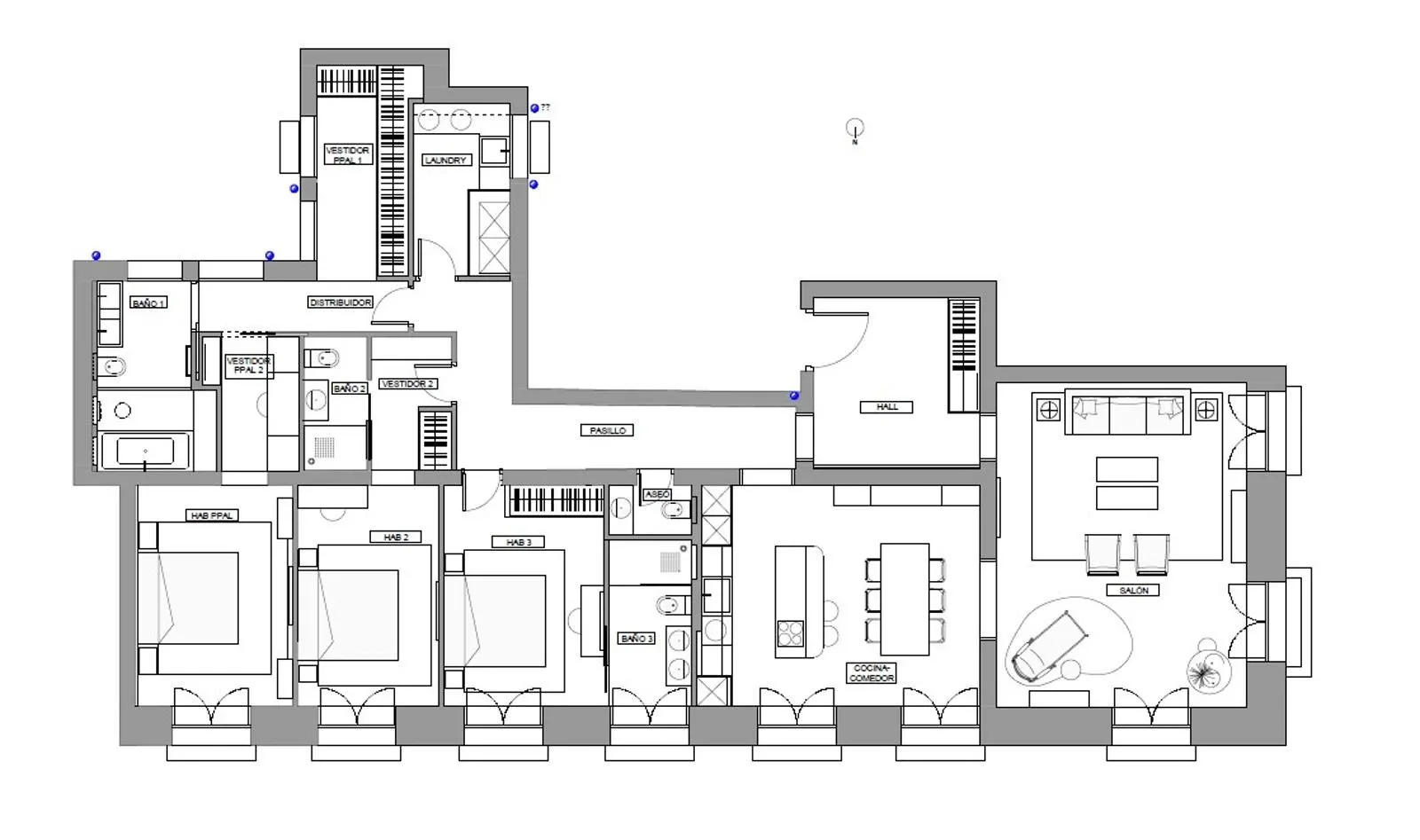 El interior ofrece una distribución equilibrada y funcional, con tres amplios dormitorios, tres baños completos y un aseo de cortesía, pensados para garantizar la máxima comodidad y privacidad. Sus techos de 3,5 metros de altura aportan una sensación de espacio y luminosidad excepcional, mientras que los detalles clásicos y los acabados de época conservados realzan el carácter único de la propiedad.